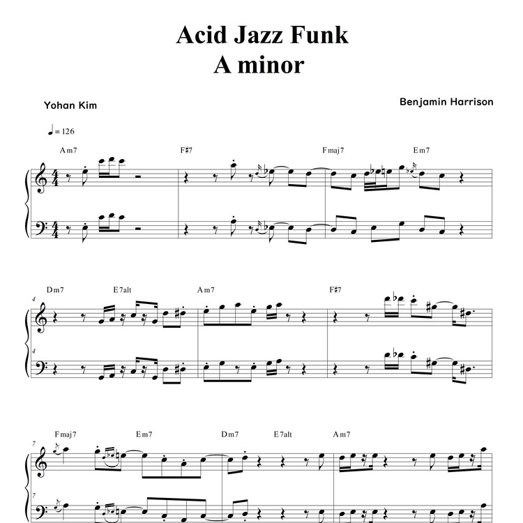 【楽譜概要】 Acid Jazz Funk in A minor (ピアノソロ楽譜) PDFファイル / A4 / 12ページ